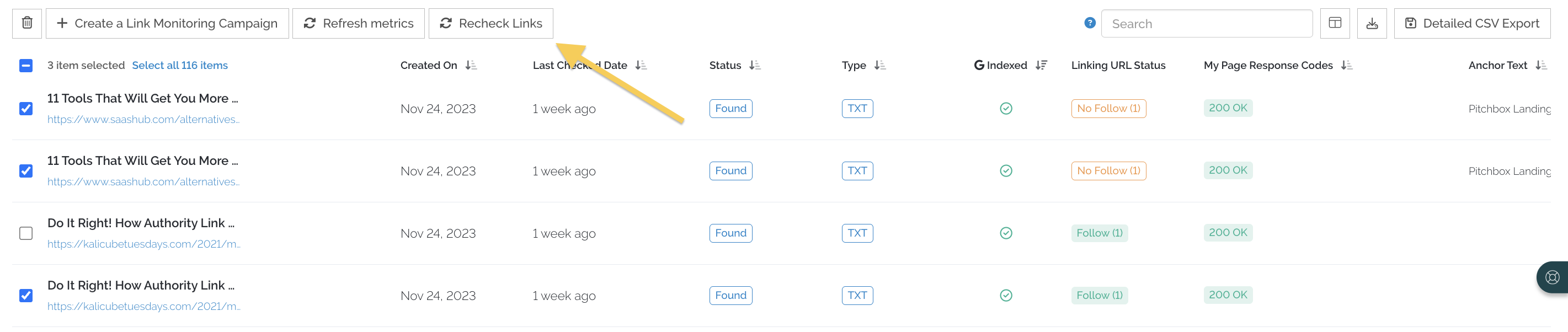 How Do I Recheck My Links in Bulk? You can recheck the status of your links in bulk directly from the Link Monitoring page. 🔗 Highlight the links you wish to recheck and click the 'Recheck Links' button at the top of the monitoring table.