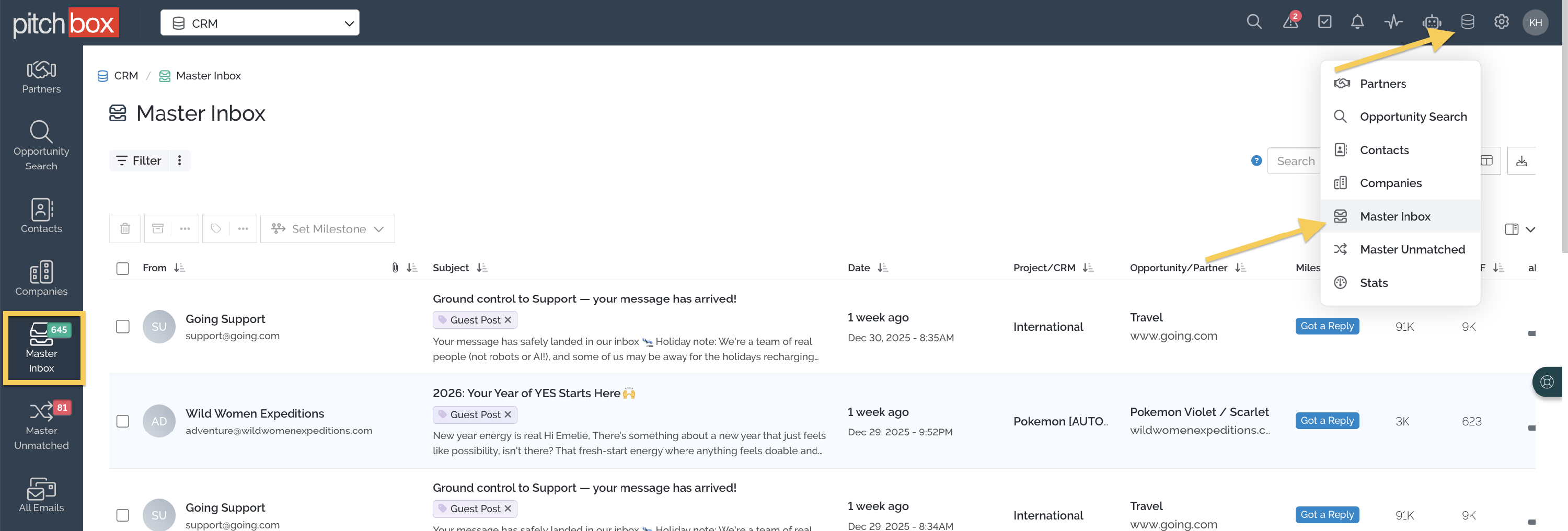 The Master Inbox contains all of your inbound emails account-wide. This includes inbound emails from each project and communications from inside your Partners. Within the Master Inbox, you can respond to emails, tag opportunities, set milestones and filter your responses.