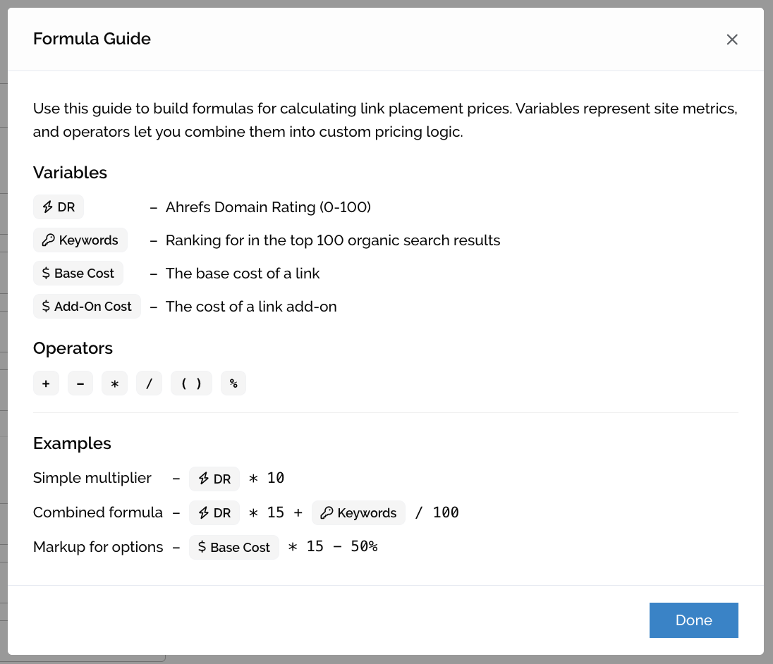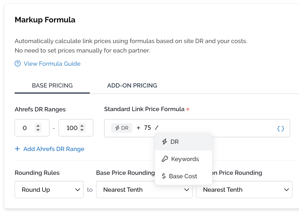 - You can use data from the opportunities Domain Rating, Keywords or Base Cost metrics to create your formula.