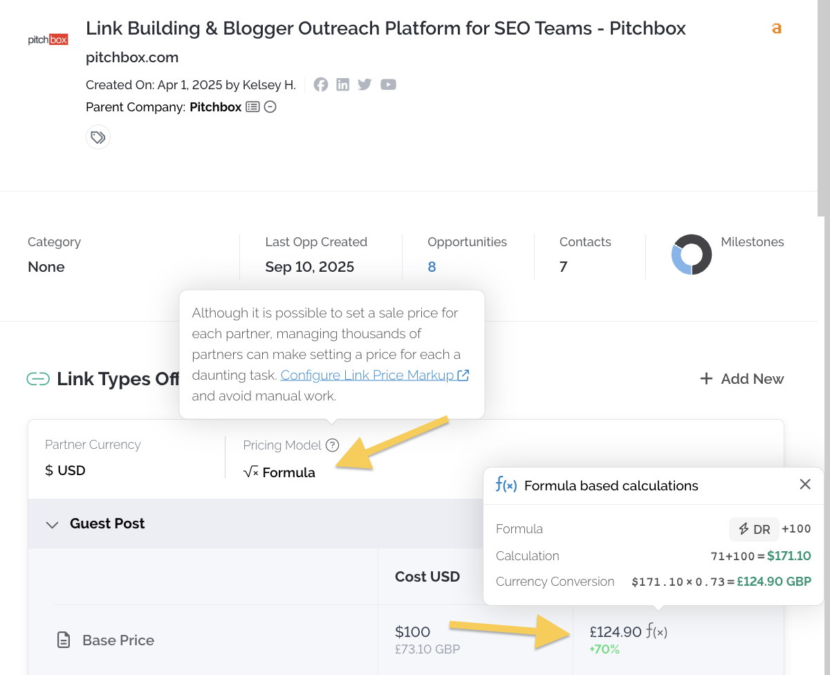 Your Link Price Markup Configuration allows you to define your currency and set a sales price formula for CRM entries.